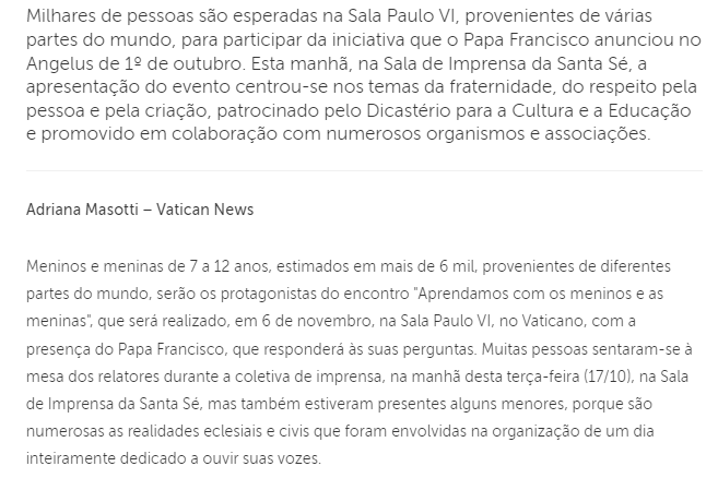 Ouça e compartilhe: https://www.vaticannews.va/pt/vaticano/news/2023-10/sala-imprensa-santa-se-dicasterio-cultura-encontro-criancas.html