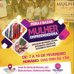 Movimento Mulheres de Peito lança Feira e Bazar da Mulher Empreendedora em Aracaju. De hoje, 7, a 10. O Movimento Mulheres de Peito lançará hoje, 7 até o dia 10 de fevereiro a Feira e Bazar da Mulher Empreendedora, que será realizada na sede das Mulheres de Peito, na Avenida Barão de Maruim, 493, das 09h às 17h. No dia do encerramento, dia 10 de fevereiro, a Feira e Bazar contará com a banda Pé no Frevo.