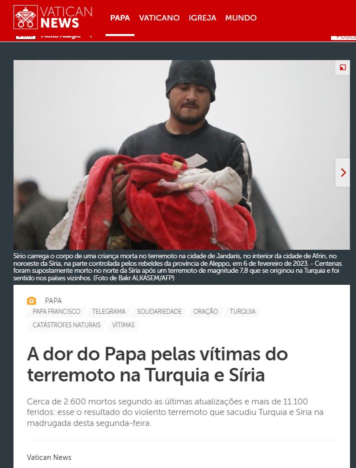 Em telegrama endereçado ao núncio apostólico na Turquia, Dom Marek Solczyński, o Papa Francisco expressa seu pesar pelo grande números de mortos devido ao terremoto de magnitude 7.8 ocorrido na madrugada desta segunda-feira.”Sua Santidade, o Papa Francisco – diz a mensagem assinada pelo cardeal secretário de Estado Pietro Parolin – ficou profundamente entristecido ao saber da enorme perda de vidas provocada pelo terremoto na região do sudeste da Turquia, enviando a garantia de sua proximidade espiritual a todos os afetados. Ouça e compartilhe: https://www.vaticannews.va/pt/papa/news/2023-02/papa-francisco-telegrama-turquia-terremoto.html
