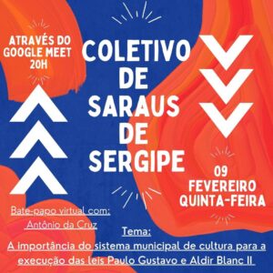 O Coletivo de Saraus de Sergipe (CSS), vai realizar no próximo dia 9, às 20h, pelo Google Meet, o debate ‘Sistema Municipal de Cultura e sua importância para a execução das Leis Paulo Gustavo e Aldir Blanc 2’. Para debater sobre o tema foi convidado o artista visual e ativista, Antônio da Cruz.