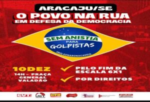 Sem anistia para golpistas, Bolsonaro na cadeia é o tema central do dia nacional de luta em defesa da democracia que será realizado hoje, 10, em todas as capitais e várias cidades do Brasil. Em Aracaju, a concentração do ato será na Praça General Valadão, às 14hs. O dia de luta está sendo construído por todas as centrais sindicais, coletivos e movimentos sociais. Toda a população deve participar deste protesto em defesa da democracia e por: