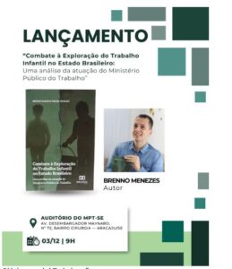 Hoje, 03, lançamento do livro “Combate à Exploração do Trabalho Infantil no Estado Brasileiro: Uma análise da atuação do Ministério Público do Trabalho”, de autoria do servidor do Ministério Público do Trabalho em Sergipe (MPT-SE), Brenno Menezes. Resultado de sua dissertação de Mestrado em Direitos Humanos, na Universidade Federal de Pernambuco (UFPE), a obra destaca a atuação do MPT com a instauração de inquéritos civis, ajuizamento de Ações Civis Públicas e medidas preventivas e educacionais, no combate ao trabalho infantil. Hoje, 03, , às 9h, no auditório do MPT-SE.