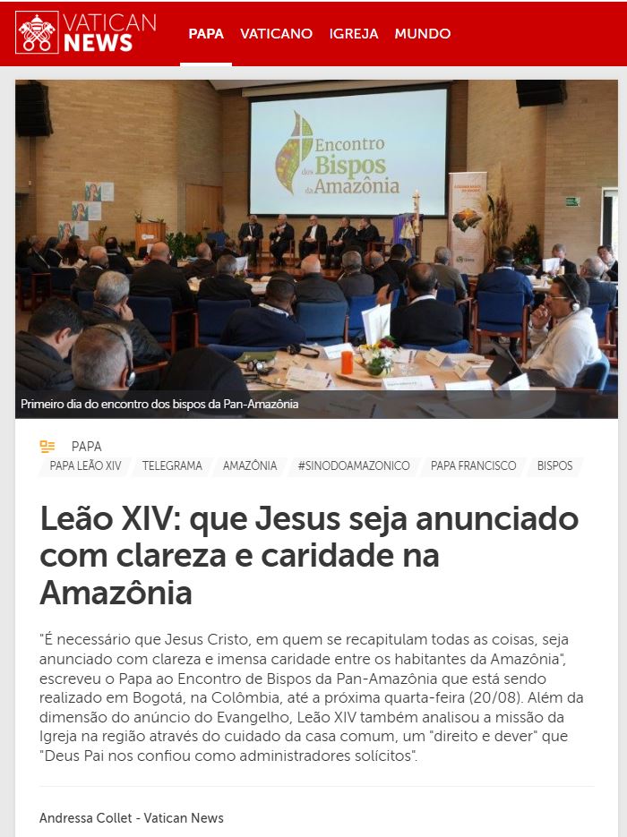 O Papa Leão XIV também se fez presente nas atividades do Encontro de Bispos da Pan-Amazônia através de um telegrama. A mensagem, assinada pelo secretário de Estado, o cardeal Pietro Parolin, foi enviada nesta segunda-feira (18/08), segundo dia do evento que termina na próxima quarta-feira, 20 de agosto, em Bogotá, na Colômbia, convocado pela Conferência Eclesial da Amazônia. Aqui:https://www.vaticannews.va/pt/papa/news/2025-08/papa-leao-xiv-bispos-conferencia-eclesial-amazonia-ceama-2025.html