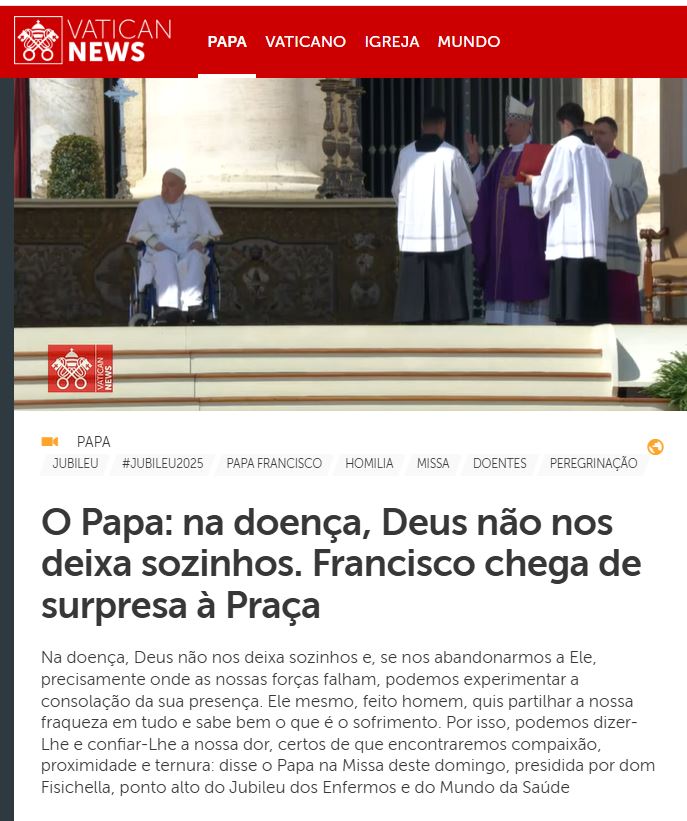 “Com o seu amor cheio de confiança, Deus envolve-nos para que, por sua vez, nos tornemos nós mesmos, uns para os outros, “anjos’, mensageiros da sua presença, a tal ponto que tanto para quem sofre como para quem presta assistência, a cama de um doente se pode transformar, muitas vezes, num ‘lugar santo’ de salvação e redenção”, disse Francisco na homilia por ele preparada para a Missa deste domingo – presidida na Praça São Pedro pelo arcebispo Rino Fisichella, pró-prefeito do Dicastério para a Evangelização -, ponto alto do Jubileu dos Enfermos e do Mundo da Saúde, com a participação de cerca de 20 mil peregrinos: pacientes, médicos, enfermeiros, farmacêuticos, fisioterapeutas, profissionais da saúde, voluntários, provenientes de mais de 90 países. Aqui: