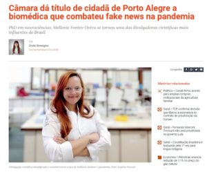 Biomédica sergipana recebe título de cidadã de Porto Alegre pelo combate a fake News na pandemia (Site Sul21) Na manhã semana passada a Câmara de Vereadores de Porto Alegre aprovou a concessão do título de Cidadã da Capital à Mellanie Fontes-Dutra, biomédica PhD em neurociências que combateu a disseminação de desinformação durante a pandemia de covid-19. O projeto é de autoria do vereador Professor Alex Fraga (PSOL). A pesquisadora é natural de Aracaju, capital do Sergipe, e veio para o Rio Grande do Sul com a família com apenas um ano de idade. “Me sinto muito lisonjeada por receber essa honraria da cidade que me acolheu desde pequena, e que tanto me oportunizou construir minha trajetória acadêmica. A atuação dentro da pandemia reforça o quanto cientistas e divulgadores científicos têm um papel relevante na sociedade, e que precisamos de políticas públicas baseadas em evidências científicas”, afirma a homenageada. Em seu trabalho nas mídias, Mellanie atua como divulgadora científica, com linguagem simples para desmistificar e traduzir produções acadêmicas, e acumula mais de 100 mil seguidores em seu perfil no Twitter e 25 mil no Instagram. A pesquisadora é também idealizadora e coordenadora da Rede Analise, membro da União Pró Vacina e da rede Todos Pelas Vacinas.