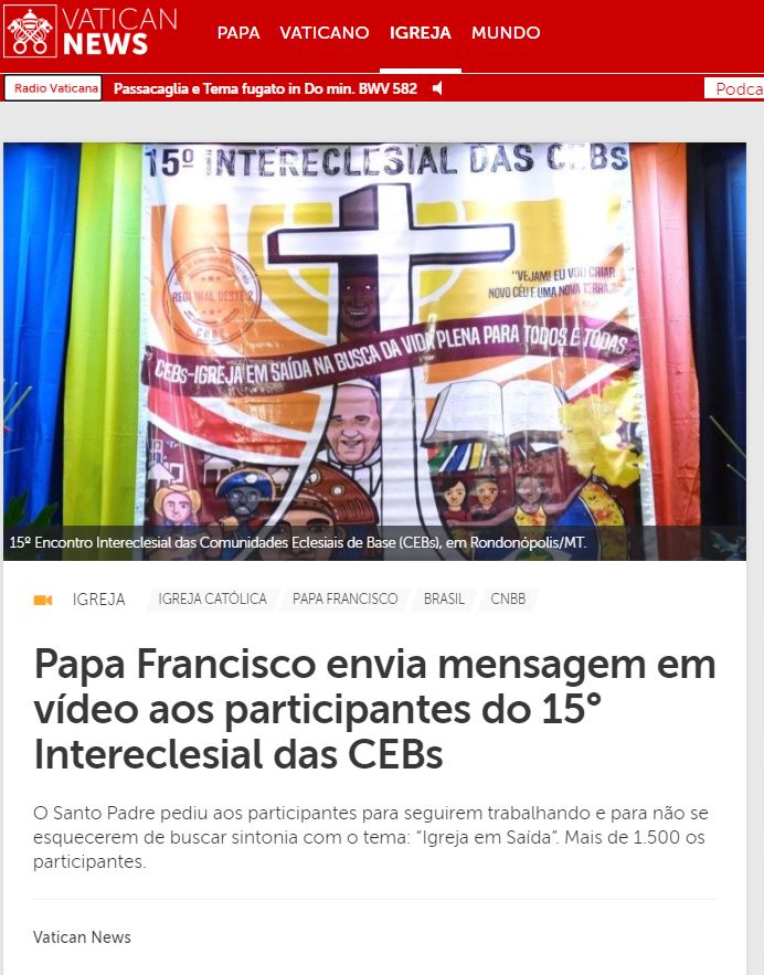Teve início na noite da última terça-feira, 18 de julho, com a celebração de abertura o 15º Encontro Intereclesial das Comunidades Eclesiais de Base (CEBs), em Rondonópolis/MT, no Centro de Eventos Santa Terezinha. O tom foi de valorização da atuação religiosa de leigas e leigos, da diversidade cultural e de crítica ao modelo socioeconômico voltado ao extrativismo dos recursos naturais. A celebração abriu oficialmente o Intereclesial que se estende até o dia 22 (sábado), reunindo cerca de 1,5 mil representantes das CEBs de todo o Brasil, além religiosas e religiosos, lideranças de organismos ligados à Igreja Católica, a outras denominações cristãs e expressões espirituais, movimentos sociais e populares. Participam do intereclesial 63 bispos. O Papa Francisco enviou uma mensagem aos participantes do encontro dizendo querer-se fazer próximo do 15º Intereclesial de CEBs. O Santo Padre pediu aos participantes para seguirem trabalhando e para não se esquecerem de buscar sintonia com o tema: “Igreja em Saída”. O Papa comparou a Igreja como a água. “Se a água não corre no rio, fica estagnada e adoece. A Igreja quando sai, caminha, se sente mais forte”, disse.