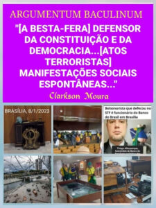 Todavia, na minha falível intelecção de anônimo profissional da advocacia mediana, o “escrete” jurídico da Besta-Fera parece “ter pisado na bola” mais uma vez, lançando mão de “argumentum baculinum”, para tentar convencer, desse modo, as autoridades competentes, ou seja, os agentes da Polícia Judiciária, do Ministério Público e da Justiça do Brasil, bem-inteirados da tessitura fático-jurídica e bem-municiados do inicial arcabouço probatório, de que ela (a Besta-Fera) — ao contrário do que remanesceu exuberante e objetivamente provado e comprovado pelas abundantes e cristalinas imagens gravadas e armazenadas pelos sistemas de monitoramento eletrônico dos prédios públicos depredados, além da bombástica e categórica “minuta de decreto” recém-encontrada na casa do comparsa Anderson Torres — não é o líder, protagonista, inspirador, recrutador e instigador (enquanto ex-presidente e ex-candidato à reeleição recém-derrotado democraticamente no último pleito presidencial, ocorrido em 30 de outubro de 2022) da horda de terroristas, arruaceiros, vândalos, milicianos, monstros, atrozes e fanáticos, que perpetrou, no fátídico domingo, 8 de janeiro de 2023, em Brasília, DF, os atos terrorísticos de invasão, vandalismo e quebra-quebra dos edifícios-sede dos três Poderes da nossa República, bem como de explícita e violenta tentativa de golpe de estado, apesar do que já havia ocorrido em 12 de dezembro de 2022, dia em que se deu a diplomação dos hodiernos Presidente e Vice-Presidente deste País, numa fiel e macabra reprodução da brutal ocupação, do impiedoso massacre e da indiscriminada destruição do Capitólio, edifício-sede do Congresso norte-americano, um dos sagrados santuários da bicentenária Democracia estadunidense. todas essas barbárias foram praticadas por verossímeis e truculentas hordas dos “terrorismos políticos” estadunidense e brasileiro, do século XXI, os quais — diga-se de boa percepção — guardam, entre si, estreita identidade de motivação ideológica e de “modus operandi”, fazendo-nos, pois, supor terem tais organizações criminosas, a mesma gênese.