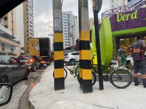 Atenção! Cadê a “tão” propalada mobilidade prefeito Edvaldo? Como a Prefeitura aprovou este projeto? Dois postes, um deles no meio da calçada. A rua estreita e a calçada ocupada, os pedestres que se virem…. Avenida Jorge Amado, bem em frente a Drogasil. Será que foi privilegio para a VerdFrut Hortimercado que tem lojas em quase todo Nordeste?