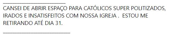 Espero que estes católicos irados que desqualificam qualquer bispo ou padre que ousa ensinar um fiel a pensar como católicos, consigam o que querem. Querem um Brasil direitista ou esquerdista, porque está claro que não aceitam nenhuma pregação moderada que propõe diálogo político, social e ecumênico.