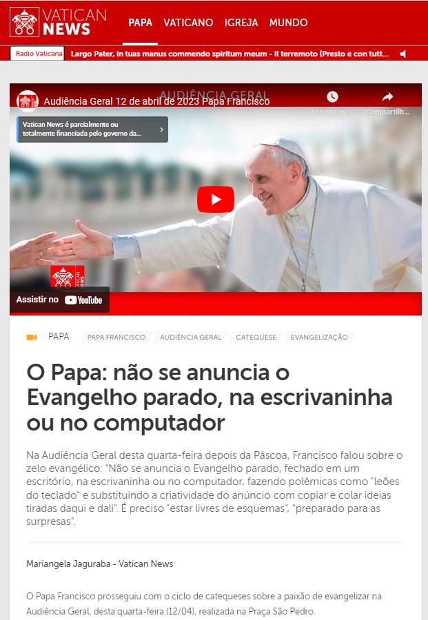 Ouça e compartilhe: https://www.vaticannews.va/pt/papa/news/2023-04/papa-francisco-audiencia-geral-evangelho-escrivaninha-computador.html