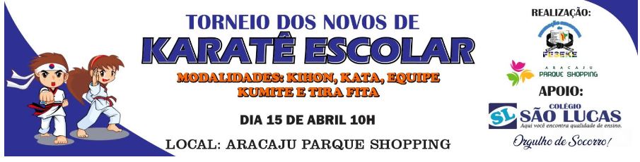 1º Torneio de Novos do Karatê Escolar No próximo sábado, 15, a partir das 10, no Aracaju Parque Shopping será realizado o 1º Torneio de Novos do Karatê Escolar numa realização da Feseke com o próprio shopping e o apoio do Colégio São Lucas referência na educação particular em Nossa Senhora do Socorro.