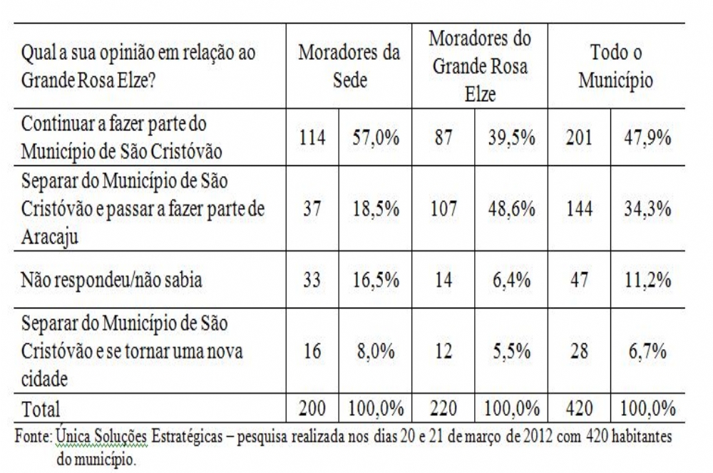 Este sentimento é refletido fielmente em uma pesquisa de opinião pública realizada recentemente em que se perguntou aos moradores do município como eles se sentiam quanto a separação da região do Grande Rosa Elze. O quadro que apresento abaixo demonstra que, quando analisado separadamente, 51,1% dos moradores que residem na região em questão são favoráveis a separação do município de São Cristóvão. Do total, 48,6% entendem que a região deveria se incorporar ao município de Aracaju, enquanto que apenas 5,5% optaram pela formação de um novo município.