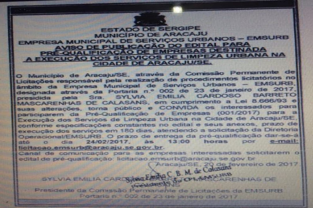de Aracaju com o edital de qualificação das empresas para o contrato emergencial de seis meses. Com prazo para entrega da pré-qualificação até amanhã, 24. Será que o TCE vai deixar?