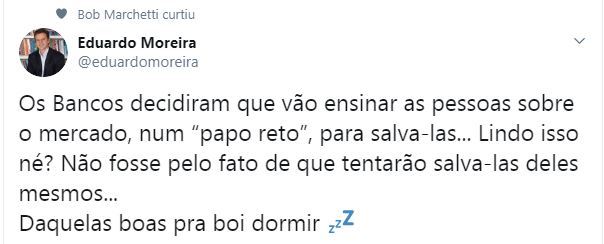 www.twitter.com/eduardomoreira Os Bancos decidiram que vão ensinar as pessoas sobre o mercado, num “papo reto”, para salva-las… Lindo isso né? Não fosse pelo fato de que tentarão salva-las deles mesmos… Daquelas boas pra boi dormir…zzzz 💤