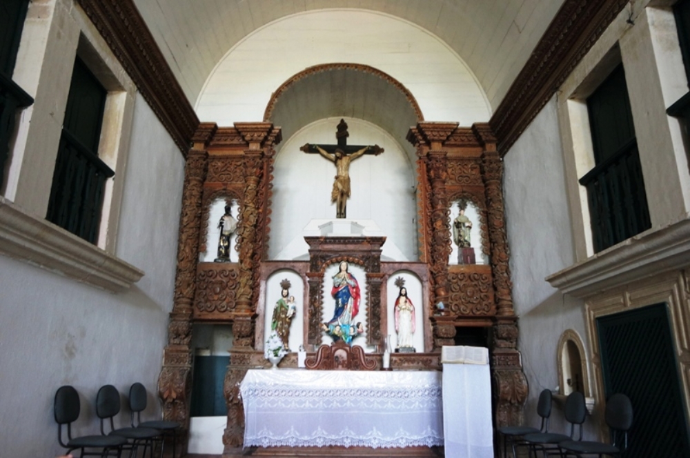 As imagens sobre o altar da igreja não são originais, mas harmonizam com o altar totalmente talhado na madeira. No andar superior, há uma bela vista do entorno de Laranjeiras.