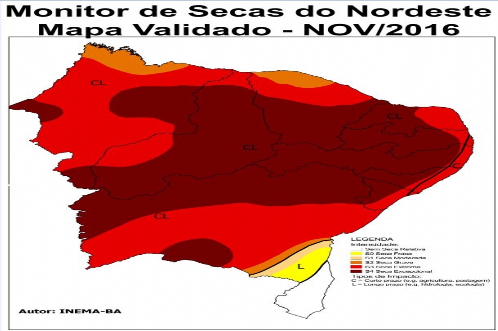 Estado, a exemplo da expansão (para leste) das áreas S3 (seca Extrema) e S4 (seca Excepcional). Com isso, a estreita faixa de seca Grave (S2), identificada nos meses anteriores, deixou de existir, sendo substituída pela seca de intensidade Extrema (S3). Em relação aos impactos, estes ainda se mantiveram de curto prazo (C), na faixa da zona da mata e litoral e, de curto e longo prazo (CL), nas demais áreas do Estado.