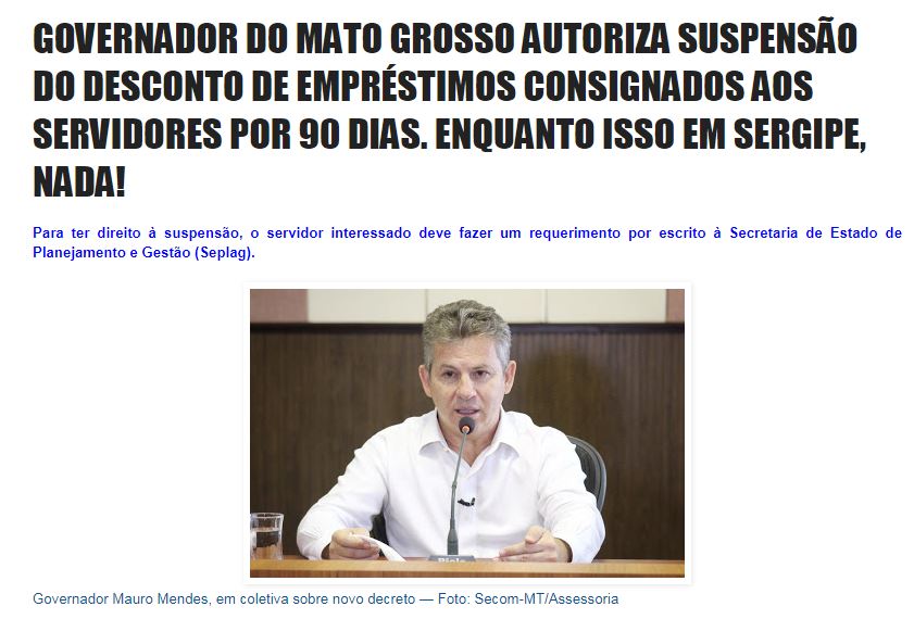 Nota do blog Espaço Militar: Há exatos 24 dias o Governo do Mato Grosso tomou a medida de suspender o desconto do empréstimo consignado. Enquanto isso aqui em Sergipe, o governo diz que iria suspender, mas o que se viu foi o Banese refinanciar as parcelas, cobrando mais prestações e juros, aumentando consideravelmente o saldo devedor.