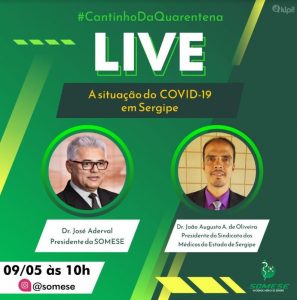 Live SOMESE Da assessoria da SOMESE; Em constante crescimento, a presença do COVID-19 em nosso Estado nos deixa em alerta a todo instante, mas como os órgãos responsáveis estão lidando com esta realidade? Quais as principais ações e medidas para contenção? Nossa live do dia 09, iremos debater sobre: “A situação do COVID-19 em Sergipe” em que contaremos com a presença do Dr. João Augusto Alves de Oliveira (Médico da atenção primária em Aracaju desde 2006/Especialista em Gestão de Saúde Pública e da Família/Presidente do Sindicato dos Médicos do Estado de Sergipe). Separe suas perguntas e participe conosco!”