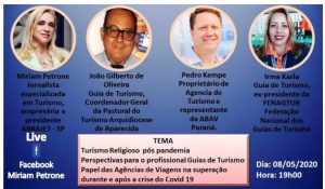 Covid 19 Os profissionais de turismo e interessados no tema terão oportunidade de assistirem amanhã, 08, a partir das 19h pelo Facebool – Mirina Petrone uma live com a abordagem de temas relacionados ao turismo como Turismo Religioso pós pandemia e perspectivas para o profissional Guias de Turismo. Os convidados: João Gilberto de Oliveira Guia de Turismo, Coordenador Geral da Pastoral do Turismo Arquidiocese de Aparecida, fundador da Associação dos Guias de Turismo do Circuito Turístico Religioso e idealizador da Romaria Nacional dos Profissionais de Turismo à Aparecida. tem formação em administração, turismo e eventos, atualmente trabalha no Centro de Apoio ao Romeiro (Santuário Nacional de Aparecida);Irma Karla Guia de Turismo desde 1991, formada em Relações Públicas, Ex- presidente da FENAGTUR – Federação Nacional dos Guias de Turismo e membro do CNT – Conselho Nacional de Turismo (2011-2017).Pedro Kempe, Proprietário da DOMUS Viagens, Conselheiro da ABAV e Participante do GT de Turismo Religioso do Paraná. A live terá como moderadora Miriam Petrone, Jornalista especializada em Turismo, Turismóloga, Empresária, Crítica gastronômica, Chef de cozinha, Consultora de Turismo, Conselheira do Conselho Estadual e Municipal de Turismo de São Paulo, presidente ABRAJET-SP, Ex-presidente ABRAJET Nacional, Ex-presidente do Fórum Iberoamericano de Periodista de Turismo (9 países) e membro do CNT – Conselho Nacional de Turismo (2014-2018).