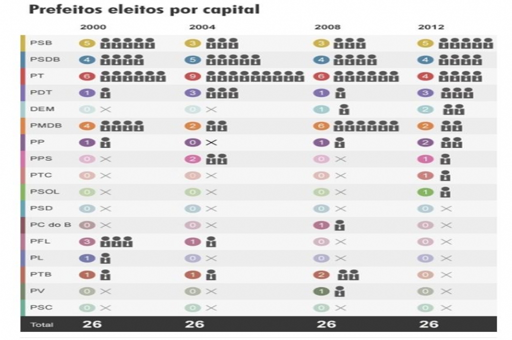 Cuiabá, e Mauro Nazif, em Porto Velho, o PSB (Partido Socialista Brasileiro) passou a ser o partido que governará o maior número de capitais no país, tomando o posto do PMDB e do PT, que empatavam em número de municípios liderados.Os dados consideram o partido do prefeito eleito quando ocorreu a disputa. Se o vice assumiu o posto ou houve troca de partido, essa mudança não foi considerada.