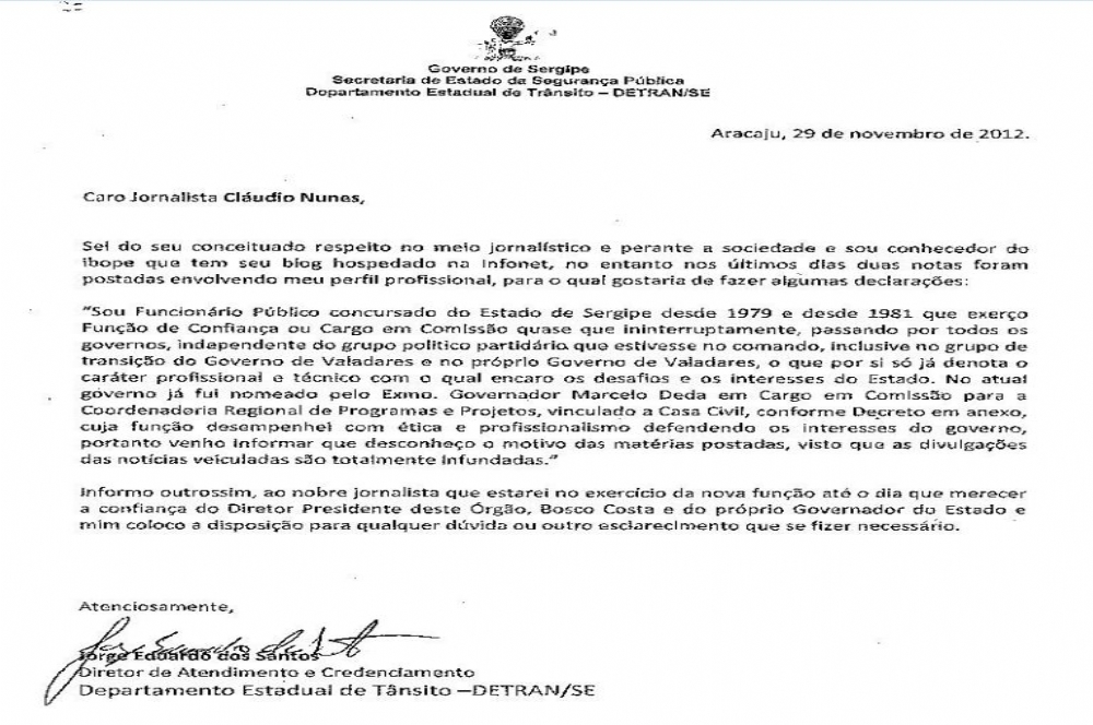 O blog recebeu um e-mail do senhor Jorge Eduardo dos Santos, nomeado recentemente para uma direção no Detran/SE com