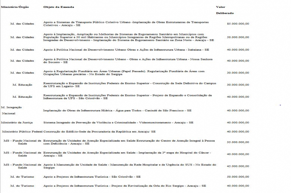As emendas são voltadas para transporte público, saneamento básico, infraestrutura urbana e hídrica, regularização fundiária, reestruturação e expansão da Universidade Federal de Sergipe, segurança, saúde e turismo na capital, Aracaju, e em municípios do estado. O coordenador da bancada, senador Antonio Carlos Valadares (PSB), ficou satisfeito com o resultado das emendas coletivas propostas, de forma consensual e unânime, pela bancada federal sergipana. "Todos os parlamentares da bancada, indistintamente, colaboraram para o atendimento às necessidades mais prementes da população sergipana", declarou.