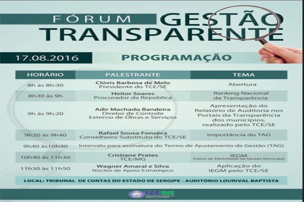 O Tribunal de Contas do Estado de Sergipe (TCE/SE) realizará amanhã, 17, a partir das 8h, o I Fórum Gestão Transparente, voltado a todos os