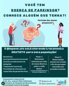 Laboratório de Pesquisa em Neurociências – Lapene – UFS no instagram: https://www.instagram.com/lapene.ufs/           Estamos recrutando indivíduos com Doença de Parkinson para receber tratamento em nosso laboratório, por meio da adesão às nossas pesquisas‼ Tod@s aqueles que se interessarem passarão por uma “bateria” de exames (cardiovasculares, neurológicos, funcionais) e receberão relatório dos seus resultados. Não será necessário pagar, de nenhuma maneira, por isso‼ Os voluntários também serão convidados a participar de atividades de exercícios em grupo, conduzidas por nossas pesquisadoras, específicas para pessoas com Doença de Parkinson‼ A adesão em uma fase da pesquisa não obriga o voluntário a participar da próxima. Você pode sair da nossa lista de chamada quando quiser, sem nenhum dano, ou custo‼ Todos os exames serão realizados pelo nosso laboratório de pesquisa e são totalmente GRATUITOS‼  Todos os atendimentos serão realizados com horário marcado previamente, não sendo necessário chegar ao local muito antes do tempo acordado com a pesquisadora‼ Uma vez em nossa lista de voluntários, a cada pesquisa você será CONVIDADO a participar.Lembramos que todas as pesquisas do nosso grupo são conduzidas pela Prof. Dra. Josimari Melo DeSantana, @josi_desantana, coordenadora do Laboratório de Pesquisa em Neurociência (LAPENE), @lapene.ufs, da Universidade Federal de Sergipe. Deixamos claro que não temos limitações quanto a idade, raça, etnia, credo, gênero ou sexualidade. Nossas pesquisas são destinadas a PESSOAS com Doença de Parkinson‼ Conhece alguém com Doença de Parkinson Fale conosco. Explicaremos nossos objetivos e, se for do seu interesse, seguiremos com os procedimentos. Atenção: todas as nossas pesquisas seguem os princípios do Conselho Nacional de Saúde, em sua resolução 510 de 7 de abril de 2016, que rege as normas morais e éticas de como devem ser conduzidas as pesquisas em Ciências Humanas e Sociais. Portanto, os direitos dos voluntários estão assegurados por lei federal. (E-mails para contatos no print ao lado).