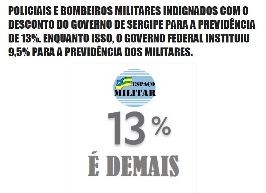 Diversos policiais e bombeiros militares têm demonstrado sua indignação com o desconto do Governo de Sergipe para a previdência de 13%, inclusive já se encontra o desconto de tal percentual no salário de março, que será pago agora em abril.