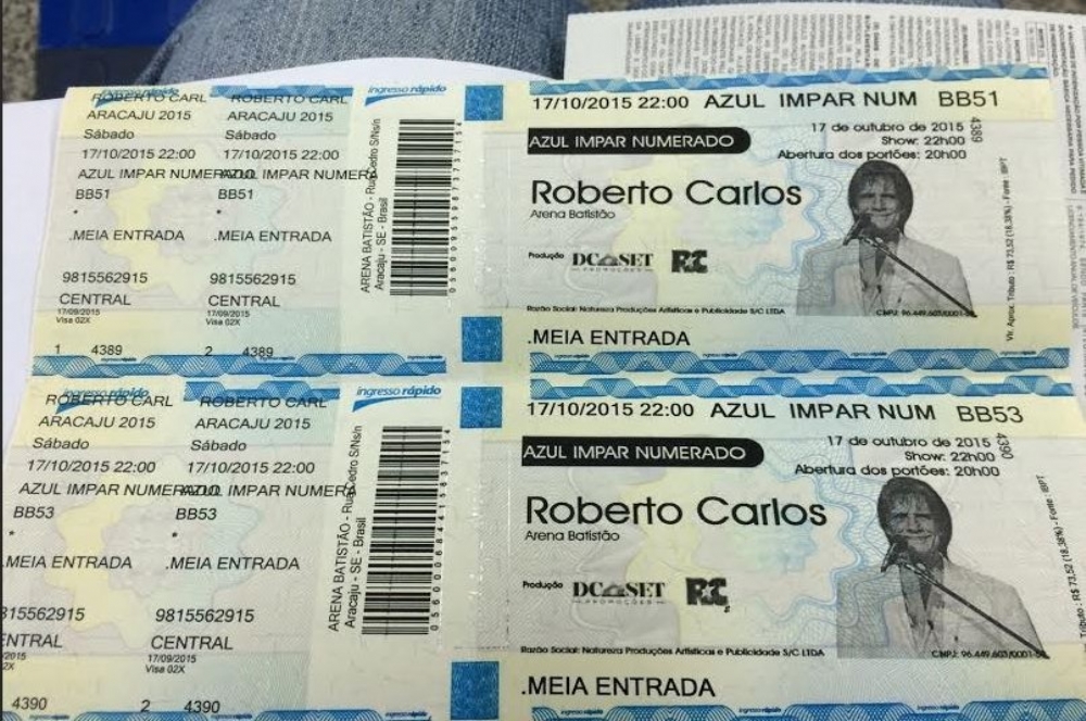 entrada. São todos assim. A produção do show de Roberto Carlos, imprimiu os ingressos como se fossem de meia entrada, o que constitui uma burla ao Estatuto do Idoso e ao direito aqueles que podem pagar meia entrada. Com a palavra o MPE e o Procon. A produção é da DC SET e RC, mas em Sergipe dizem que o show tem o apoio de Fabiano Oliveira”.