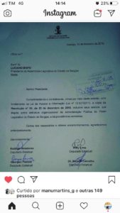 lado o print do ofício encaminhado ao presidente da Assembleia de Sergipe, Luciano Bispo assinado pelos deputados Rodrigo Valadares, Georgeo Passos, kitty Lima e Samuel Carvalho, pedindo, com base na Lei de Informação, cópia da resolução número 50, de 20 de dezembro de 2018, que dispõe sobre a estrutura organizacional do Poder Legislativo. Algumas perguntas: Há atos secretos na Assembleia? Se trata dos cargos comissionados?