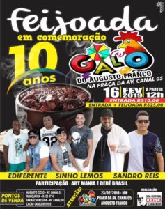tradicionais da capital sergipana, o Bloco Galo do Augusto Franco comemora 10 anos com feijoada e folia no próximo sábado, 16/2, em uma grande prévia para o Galo que acontecerá dia 23/2. A festa, que terá início a partir das 12h, contará com a animação da Banda Ediferente, Sinho Lemos e Sandro Reis. A agremiação tem como idealizador o psicólogo Carlos Max Prejuízo através da Casa Cultural Careca e Camarada e tem como objetivo resgatar a tradição dos antigos carnavais de rua, reunindo pessoas de todas as idades. Todos os anos, o Bloco leva para avenida uma obra de mais de quatro metros de altura, assinada pelo artista Anselmo Seixas. Entrada: R$25,00 (entrada + feijoada) / R$10,00 (só entrada). Pontos de venda: Augusto Ciclo, Farmácia Moura, MaxClínica e Cacau Cabeleireiros.