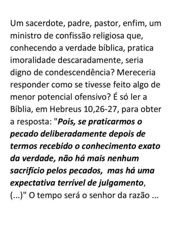 Um sacerdote, padre, pastor, enfim, um ministro de confissão religiosa que, conhecendo a verdade bíblica, peca descarada e deliberadamente, merece condescendência? Merece responder como se tivesse feito algo de menor potencial ofensivo? É só ler Hebreus 10,26-27, para ter a resposta: “Pois, se praticarmos o pecado deliberadamente depois de termos recebido o conhecimento exato da verdade, não há mais nenhum sacrifício pelos pecados, mas há uma expectativa terrível de julgamento, (…)”