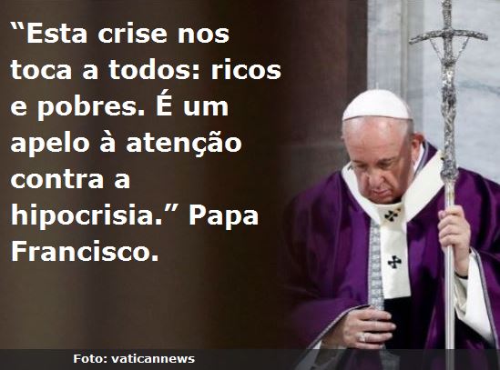 “Esta crise nos toca a todos: ricos e pobres. É um apelo à atenção contra a hipocrisia. Preocupa-me a hipocrisia de alguns políticos que dizem que querem enfrentar a crise, que falam da fome no mundo, enquanto fabricam armas. É o momento de nos convertermos desta hipocrisia em ação. Este é um tempo de coerência. Ou sejamos coerentes ou perdemos tudo”.