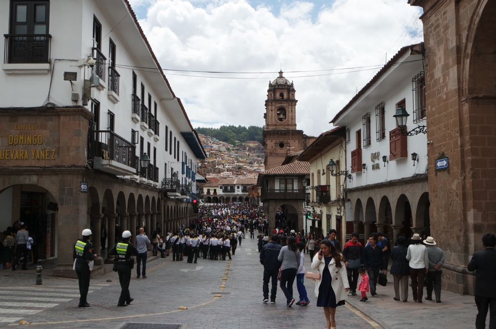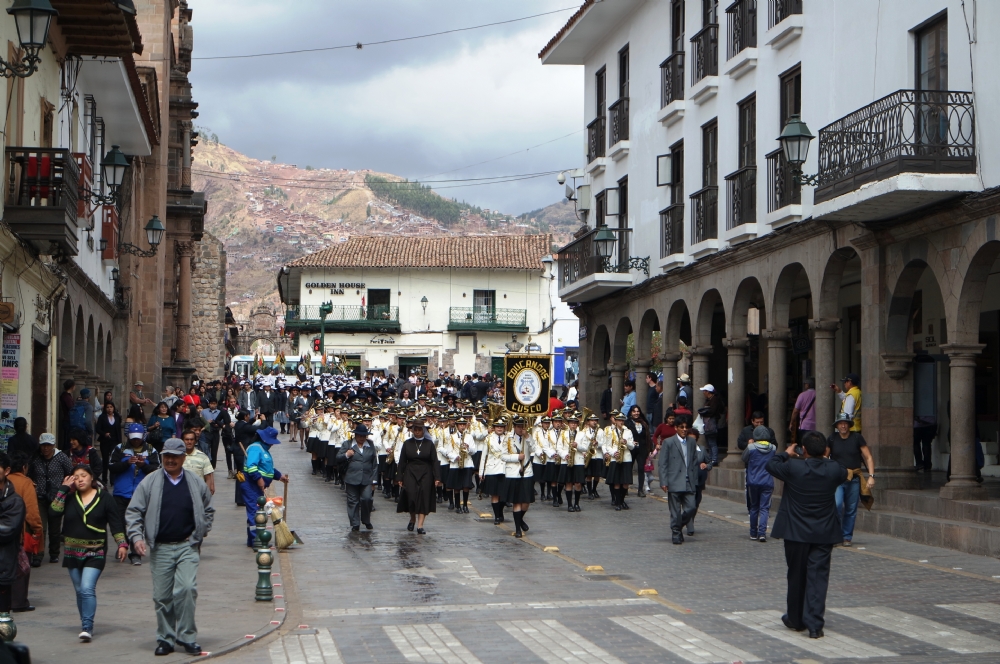 É no tecer das cores das mantas, no quéchua do falar, na criação das lhamas, alpacas e vicunhas, no cultivo da variedade de milhos e de batatas, no manipular dos alimentos de rua que os cusquenhos mantém os milenares saberes. É aos domingos quando escolas, organizações não governamentais e governamentais, instituições civis, empresas, sindicatos saem as ruas, religiosamente, para homenagear alguém ou algo, celebrar um acontecimento ou simplesmente hastear a bandeira da cidade. Todos os domingos as ruas de Cusco é uma festa.