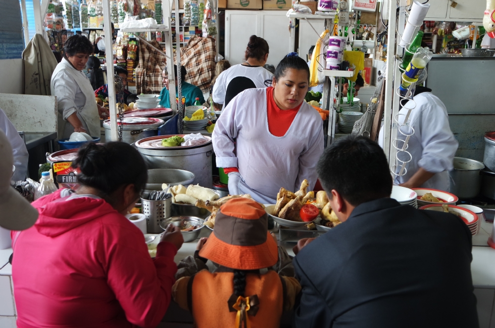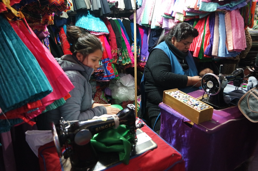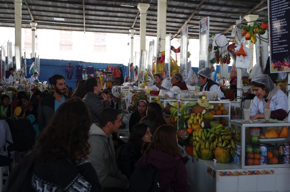 No mercado de Cusco, as tradições das vestes são tecidas por senhoras em máquinas de costura, enquanto que em barracas coloridas sucos de frutas regionais acompanham as sopas de frango, de quinoa, ceviches e chicha morada sem cerimônia. Cerimônia mesmo se revela ao centro do mercado com as imagens de Nossa Senhora das Mercedes e São Pedro envoltos de oferendas e velas.