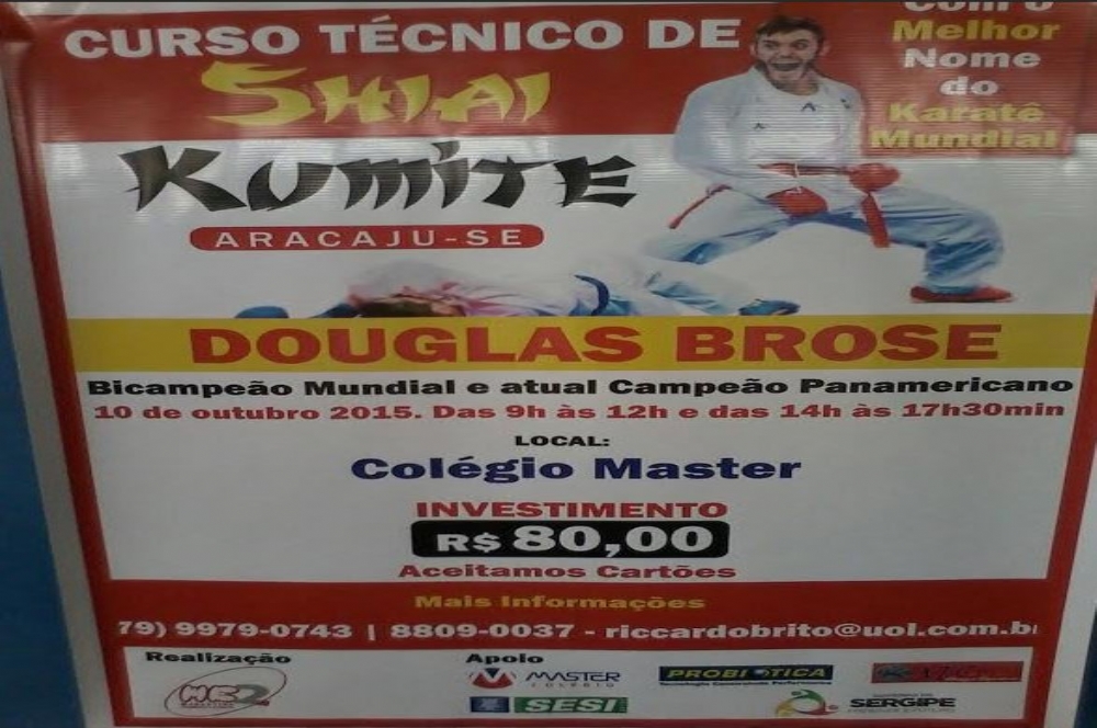 Os praticantes do karatê de todas federações e todos os estilos não podem perder o curso técnico de Shiai Kumite, no dia 10 de outubro, nos dois turnos, com o bicampeão mundial e atual campeão Pan-Americano, Douglas Brose, atualmente o melhor mundialmente. O investimento é de apenas R$ 80,00 (todos cartões), o curso será ministrado no colégio Master. Mais informações pelos telefones: 9979- 0743 e 8809 – 0037. Ou pelo e-mail: http://riccardobrito@uol.com.br