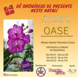 4ª Mostra de Orquídeas Com o objetivo de encerrar o ano apreciando belas flores e perfumes, a Orquidófilos Associados de Sergipe – OASE, realizará de hoje, 03 até a sexta-feira, 05, a sua 4ª Mostra de Orquídeas. O evento acontecerá no mall do Ferreira Costa e contará com a exposição de plantas cultivadas pelos associados e vendas de orquídeas diretamente do produtor. Mais detalhes aqui: https://www.instagram.com/oasergipe/