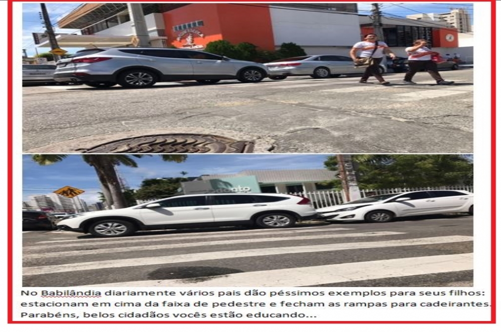pode, tiraram fotos ontem,02, de carros estacionados em cima da faixa de pedestre e obstruindo as rampas para cadeirantes no fim das aulas da manhã no Jardim Escola Babilândia, no Bairro Salgado Filho. Uma sugestão: na semana do trânsito pegar estes pais e convidarem eles para educarem corretamente seus filhos.