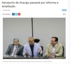 R$ 110 milhões Em 02 de junho de 2017 o então governador Jackson Barreto ao lado do líder de Temer no Congresso, André Moura, anunciaram uma importante obra de ampliação para o Aeroporto Santa Maria na ordem de R$ 110 milhões. O mais curioso é que a Infraero já investiu R$ 60 milhões na pista de pouso e decolagem sem contar com os R$ 110 milhões prometidos para o novo terminal. Leia aqui. Agora, no próximo dia 15 de março o aeroporto está entre os aeroportos que serão leiloados pelo governo federal. É ou não é mais um engodo patrocinado por Jackson Barreto e André Moura?