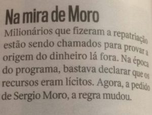 Na mira de Moro. Tem Sergipano que vai ter problema para explicar Milionários que fizeram a repatriação estão sendo chamados para provar a origem do dinheiro lá fora. Na época do programa, bastava declarar que os recursos eram lícitos. Agora, a pedido de Sérgio Moro, a regra mudou. Tem Sergipano que vai ter problema para explicar.