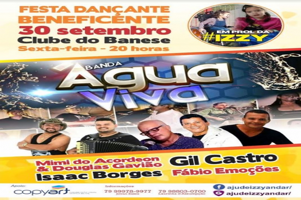 setembro a partir das 20h, no Clube do Banese. Banda Água Viva, Isaac Borges, Gil Castro, Fábio Emoções, Mimi do Acordeon e Douglas Gavião. Mesa: R$ 100,00.Individual: R$ 25,00Visitem a página: https://www.facebook.com/AJUDE-IZZY-ANDAR-116322908784078/?fref=ts