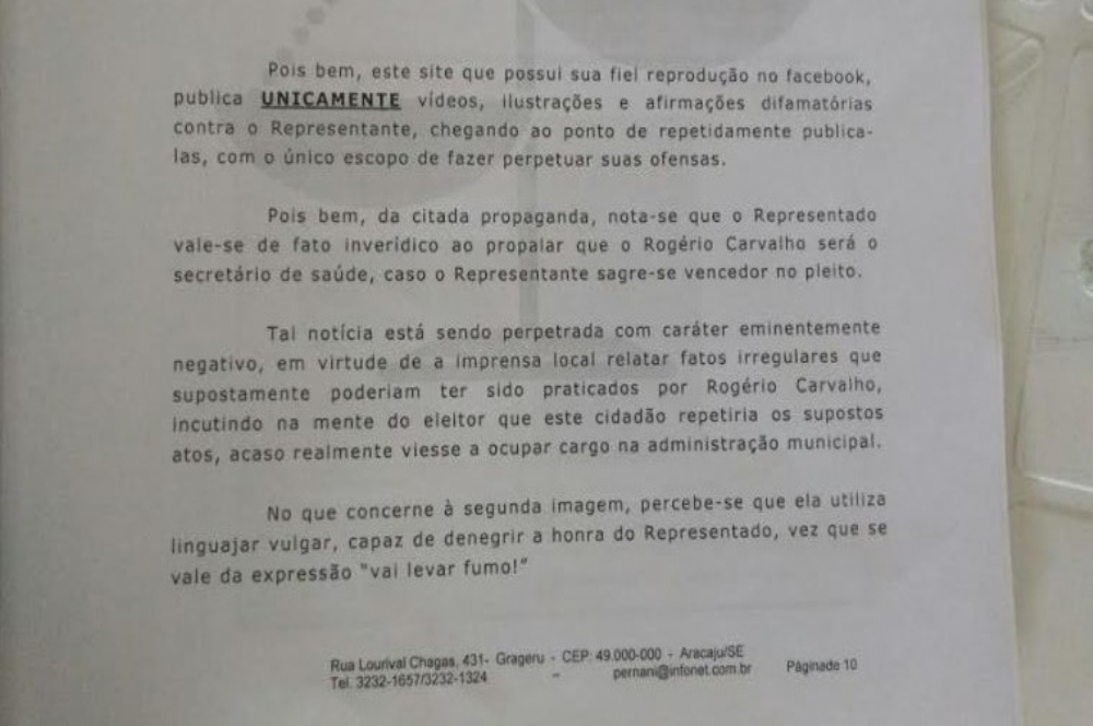 “Tal notícia está sendo perpetrada com caráter eminentemente negativo, em virtude de a imprensa local relatar fatos irregulares que supostamente poderiam ter sidos praticados por Rogério Carvalho, incutindo na mente do eleitor que este cidadão repetiria os supostos atos, acaso viesse realmente a ocupar cargo na administração municipal”. O blog não vai analisar, até porque é um parágrafo de uma peça jurídica, porém serve de reflexão.