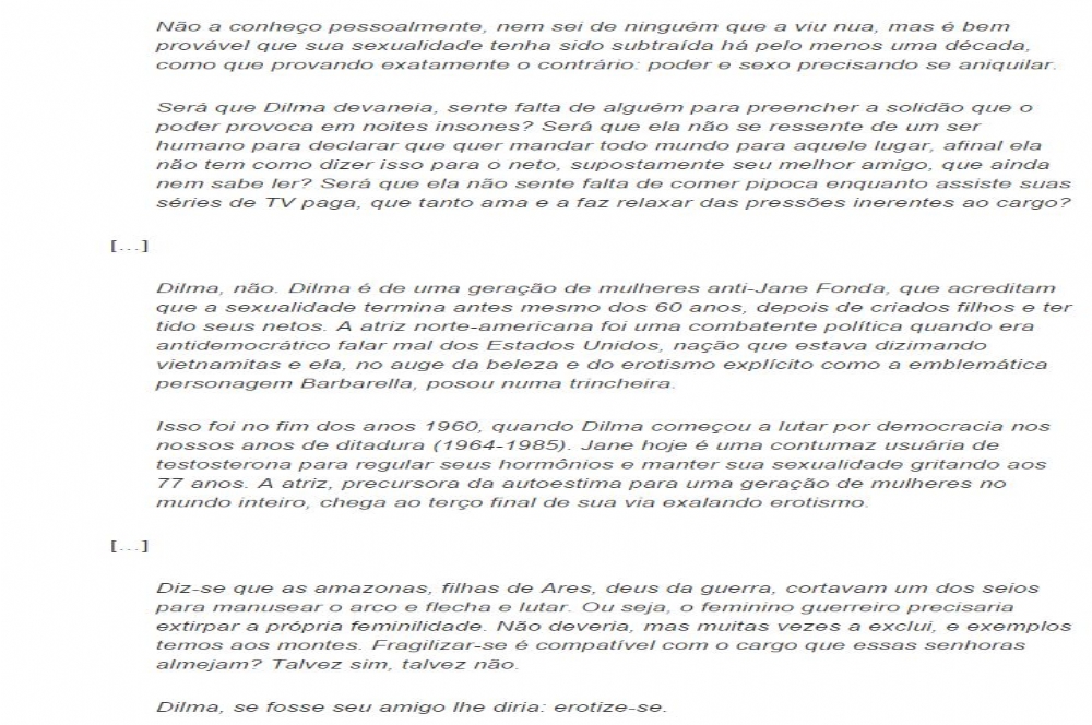 “Não a conheço pessoalmente, nem sei de ninguém que a viu nua, mas é bem provável que sua sexualidade tenha sido subtraída há pelo menos uma década, como que provando exatamente o contrário: poder e sexo precisando se aniquilar… Será que Dilma devaneia, sente falta de alguém para preencher a solidão que o poder provoca em noites insones?” Foram várias afirmações e questionamentos sobre a sexualidade da presidente.