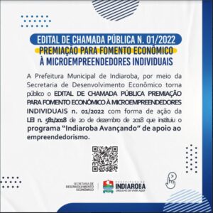 Indiaroba: Prefeitura de Indiaroba lança o Edital de Chamada Pública 01/2022. Uma ideia simplesmente genial! Como 65,5% dos negócios formais no município são Microempreendedores Individuais (MEI), a prefeitura bolou uma forma de incentivar essa moçada através duma Maratona de Modelagem de Negócios que visa incentivar novos empreendimentos e/ou aprimorar aqueles já existentes. E