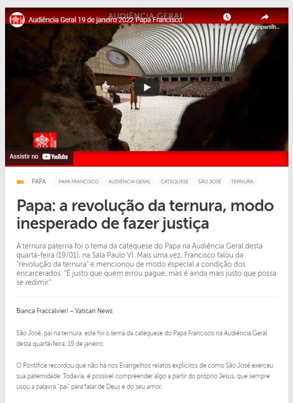 Ouça e compartilhe: https://www.vaticannews.va/pt/papa/news/2022-01/papa-francisco-audiencia-geral-sao-jose-amar-ternura-justica.html