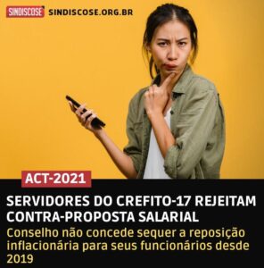 Servidores do CREFITO-17, rejeitam contra-proposta salarial. Desde 2019 sem reposição salarial Reunidos em assembleia geral na última segunda-feira, dia 26, os servidores do Conselho Regional de Fisioterapia e Terapia Ocupacional do Estado de Sergipe, CREFITO-17, reprovaram a contra – proposta apresentada pelo Conselho em relação ao acordo coletivo de trabalho. O Sindiscose vem dialogando com o Conselho, no sentindo de recompor as perdas salariais desde 2019, de lá para cá, os servidores não tiveram nem a recomposição inflacionária. A proposta do Sindicato é garantir pelo menos os reajustes de 2020 e 2021, porém o Crefito17 acenou apenas com 2021, em um período em que o Conselho teve aumento de arrecadação e de inscrições.Leia tudo em: https://sindiscose.org.br/2021/07/30/servidores-do-crefito17-rejeitam-contra-proposta-salarial/