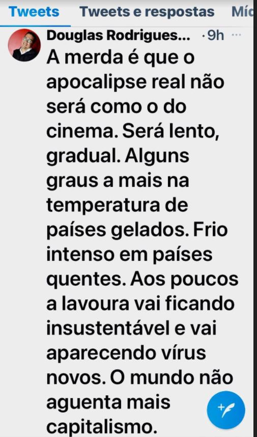 www.twitter.com/DouglasRdBarros A merda é que o apocalipse real não será como o do cinema. Será lento, gradual. Alguns graus a mais na temperatura de países gelados. Frio intenso em países quentes. Aos poucos a lavoura vai ficando insustentável e vai aparecendo vírus novos. O mundo não aguenta mais capitalismo.