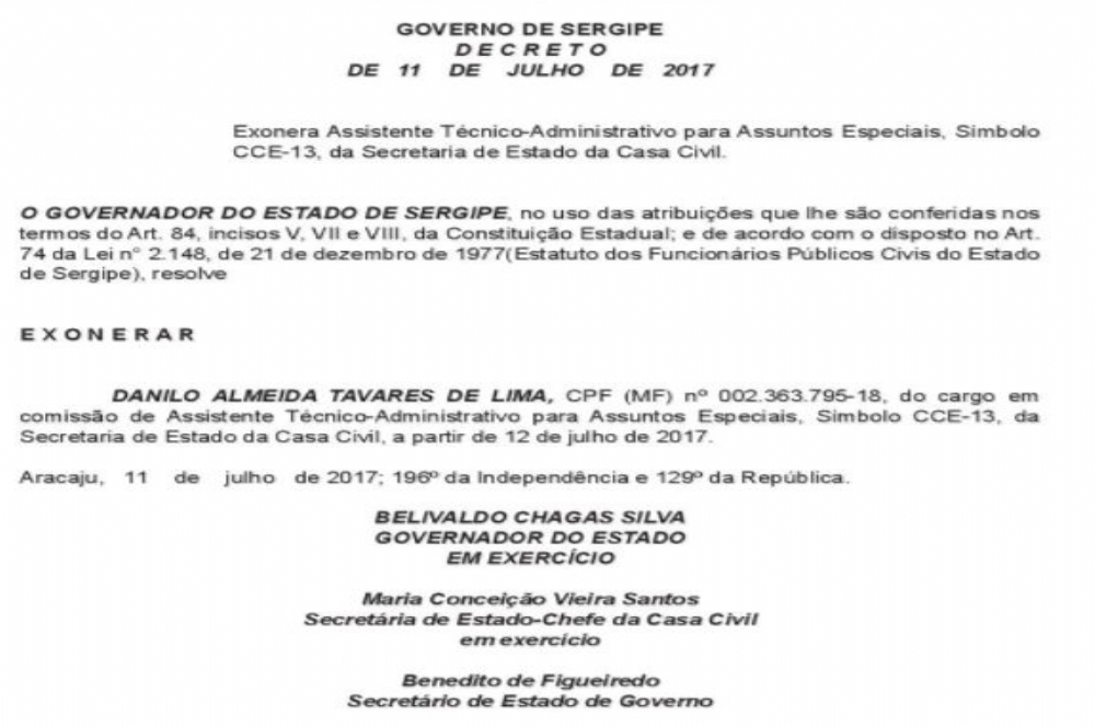 Danilo Almeida Tavares de Lima do cargo de assessor técnico-administrativo para Assuntos Especiais da Casa Civil. Danilo estava atuando ao lado do pai, Almeida Lima na Secretaria de Saúde e os sindicatos já fizeram denúncia no MPE e no TCE, por nepotismo cruzado. Ninguém duvide se Almeida nomeá-lo diretamente na saúde. Topete não falta.