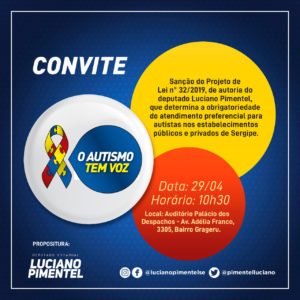 Autistas E o governador Belivaldo Chagas acertou em sancionar o projeto de lei aprovado pela Assembleia Legislativa, de autoria do deputado estadual Luciano Pimentel que dispõe sobre a obrigatoriedade do atendimento preferencial para os autistas nos estabelecimentos públicos e privados de Sergipe. O projeto de lei 32/2019 será sancionado pelo governador na próxima segunda-feira, 29, às 10h30 no Palácio de Despachos.
